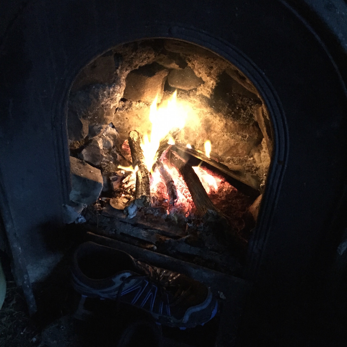 The sum of my worldly goods on the trail... Or, at least, that was the plan. My Goretex trail shoes failed to dry at all, even after hours sitting directly in front of the fire. I had not enjoyed the sensation of my feet sloshing around in buckets of water – which could have been avoided if I'd have hiked in my quick-draining Roclites – and resolved to keep the Scarpa Sparks for camp and bothy use only. My irrational fear of wet feet had led me to put the Goretex shoes on at the start of the day, but it's a tactic that has limited use in such conditions.When I was making dinner, someone else appeared at the bothy – a chap in his early twenties who was studying outdoor education and spending the week walking and climbing in the area. He had been winter climbing on Ben Nevis that week and had decided that staying in a bothy was something he should do before he went home. He frequently exclaimed his delight at the facilities freely available in Corryhully as we chatted about bothy culture and how fantastic it is that the MBA maintains these wonderful open shelters for the use of mountain-lovers in all seasons.