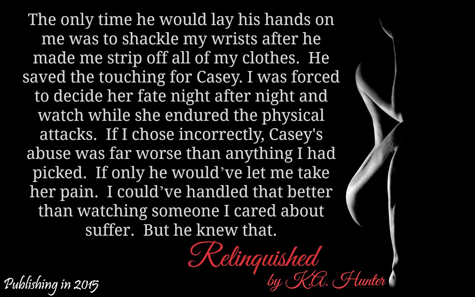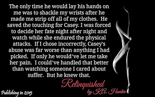 I decided to write a new novel titled, Relinquished, under the pen name, K.A. Hunter. I have no plans of hiding behind the name but the first novel, and others that will follow, is more raw and definitely grittier than my Intertwined Hearts series.