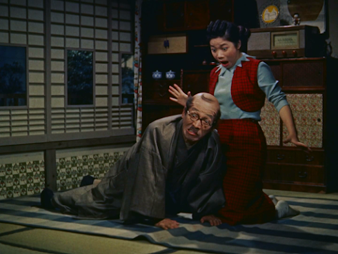 AlthoughAyako Wakao – curiously, the only one who seems to be playing it totally straight – is top-billed, in this case she’s really just part ofan impressive ensemble cast which also features Eiji Funakoshi, KeizoKawasaki and Eitaro Ozawa, most of whom make the most out of thematerial. If you enjoy Daiei films of this era and like these actors,Katei no jijo is an enjoyable time-passer, with Sei Ikeno’sscore helping to heighten the comic effect, although theblack-and-white rush hour prologue and epilogue, while fun, seem abit random to me as I couldn’t really see how they related to themain story. (I could also have done without the close-up of EitaroOzawa eating...)