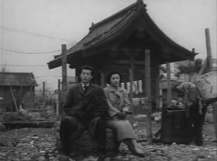 Althoughthis was far from star Hideo Takamine’s most interesting role, sheand Ryo Ikebe make for an appealing pair as they search the post-warrubble of Asakusa in search of Kenichi after he runs away –Asakusa, most of which had been destroyed by bombs, was evidently notyet fully rebuilt in 1952, the final year of American occupation.Incidentally, Takamine speaks English in several scenes here as thecompany Atsuko works for does most of its business with foreigners.Her modern, independent personality and ability to do her job well isnot always appreciated by her male colleagues, including Kaji. whoare at times quite condescending towards her.