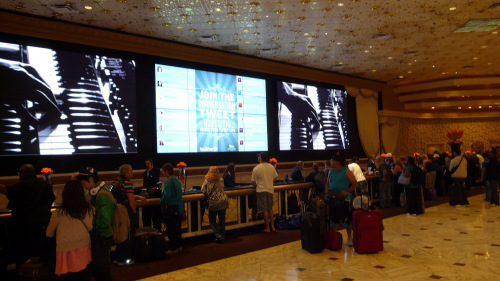 Silence. No response at all from the mighty MGM Grand. So imagine our surprise a few hours later when we walked through the lobby area and spotted my wife’s Tweet on a massive screen located on the wall behind reception staff who were checking in new residents.