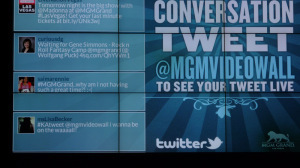 The lobby area at the MGM Grand with a big TV screen showing scrolling Tweets about the hotel