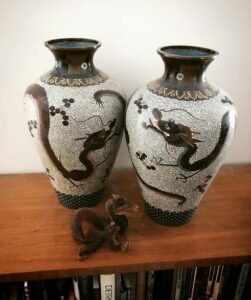 My husband Charles was born in the year of the dragon in 1928. These two dragon vases were given as a gift to Charles by Zdeněk Žárský (1912-?), a member of the Czech resistance during World War II and the Cold War. Charles was assigned as a resistance contact to Captain Zdeněk Žárský, who had a leather shop in Brno. They were involved in very dangerous work so they “transferred messages in person because it was too risky to send them by radio.”