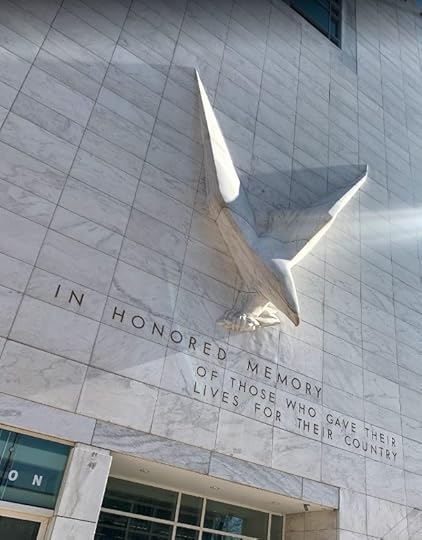 The building was dedicated in 1950 to honor the people from Michigan who gave their lives in service to their country. The memorial statement: “In honored memory of those who gave their lives for their country” was carved below the eagle. The eagle also holds olive branches representing peace and flies into the future while looking back in remembrance of the past. Photo: David Adams.
