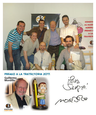En Palermo, Buenos Aires. Viviendo un momento único en la entrega del Premio a la trayectoria que la Escuela de Dibujo de mi amigo Claudio Kappel le concediera a GUILLERMO MORDILLO. Aquí posamos con el maestro, los dibujantes: (arriba) Quien esto escribe (yo), Javier Suppa, GUILLERMO MORDILLO y Claudio Kappel. (Abajo y más agachados) Cesar Da Col, Adrián Montini y Santiago Cornejo (CORNE).