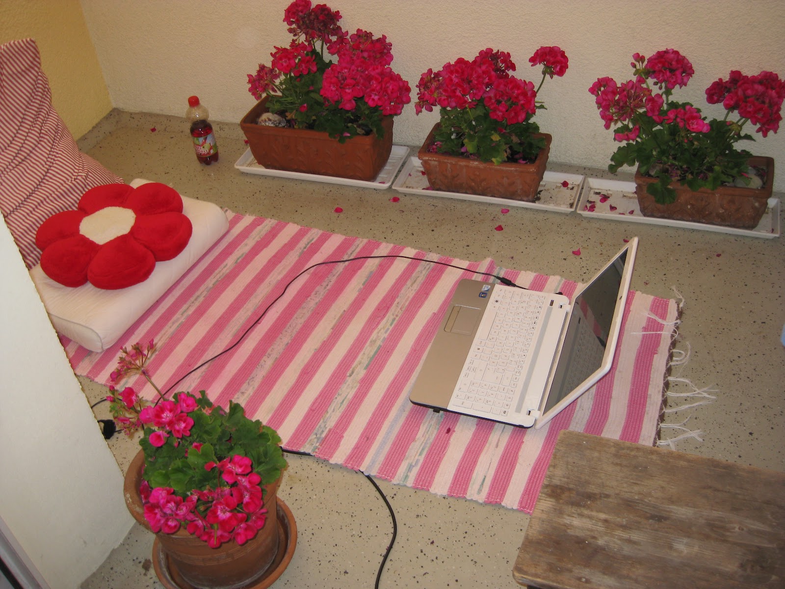Bei über 30° verschwinden die Möbel vom Balkon, die Blumen werden in den sicheren Schatten gestellt und auf dem dünnen Teppich mit kühlendem Steinboden darunter lässt es sich wunderbar schreiben.