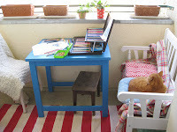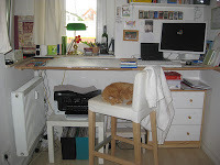 Okay, ich gebs zu, ich hab nicht nur eine "Umzieh-Macke", sondern auch eine "Umräum-Macke". Inzwischen sind die Wände im Stehschreibtisch-Zimmer mal schnell gelb und die Arbeitsplatte weiß gestrichen - weil mir alle Plätze auf einmal irgendwie langweilig vorkamen.
