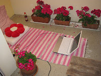 Über 30°Bei über 30° verschwinden die Möbel vom Balkon, die Blumen werden in den sicheren Schatten gestellt und auf dem dünnen Teppich mit kühlendem Steinboden darunter lässt es sich wunderbar schreiben.