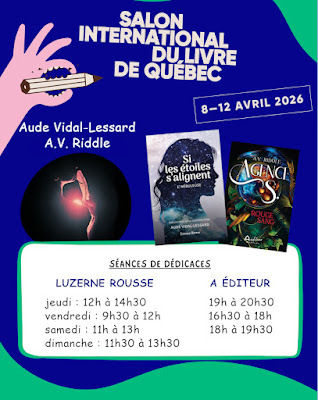 Vous pourrez m'y trouver en alternance au kiosque des Éditions Luzerne Rousse pour ma trilogie YA Si les étoiles s'alignent, ainsi qu'au kiosque de A éditeur pour ma nouvelle série de romantasy adulte Agence S. Rouge sang, le second tome, y sera d'ailleurs disponible!