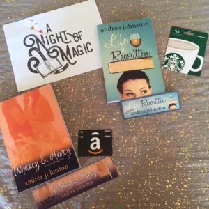 Included in this lot are Life Rewritten by Andrea Johnston; signed Life Rewritten bookmark by Andrea Johnston; Whiskey & Honey by Andrea Johnston; signed Whiskey & Honey bookmark by Andrea Johnston; $20 in Amazon gift cards; and a $15 Starbucks gift card.