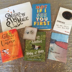 Included in this lot are Cowface And Other Hilarious Stories About Death by Mere Smith; The Blood Room by Mere Smith; Scarlett Epstein Hates it Here by Anna Brewslaw, Not If I See You First by Eric Lindstrom (signed bookplate); Girl Against the Universe by Paula Stokes; bookish ring designed by Lila Engleman; bookish necklace designed by Lila Engleman.