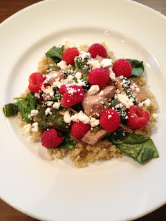 What you are looking at is a bed of quinoa (cooked in chicken broth), chicken, red onions, spinach, raspberries and feta. The chicken, spinach and red onions were stir-fried and tossed in a pomegranate vinaigrette. I'm happy to say that this dish is very tasty! Here's the link to the recipe on Shape.com. You'll notice that their picture of the dish looks a bit more professional than mine! Ha! If you end up trying this recipe, please let me know what you think!
