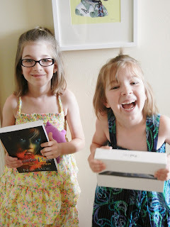 Aren't these girls SO cute??!!! Their mom entered the giveaway for them and didn't tell them that they'd won until the package arrived. I threw in a print copy of Phoebe Pope and the Year of Four as a surprise extra prize. According to the mom, she had to beg her older daughter to stop reading so that she could take the photo. Don't you totally see the hurry-up-and-take-this-photo look she's giving her mom?? And apparently the younger one spent the whole day saying, "This is the most awesome day ever!" Needless to say, that made my heart melt! I love, love doing giveaways and getting a picture like this is such a sweet bonus! The older girl wants to be a librarian when she grows up and has given my book its own shelf. It is the first in her "signed by author" collection. ;-) ;-)