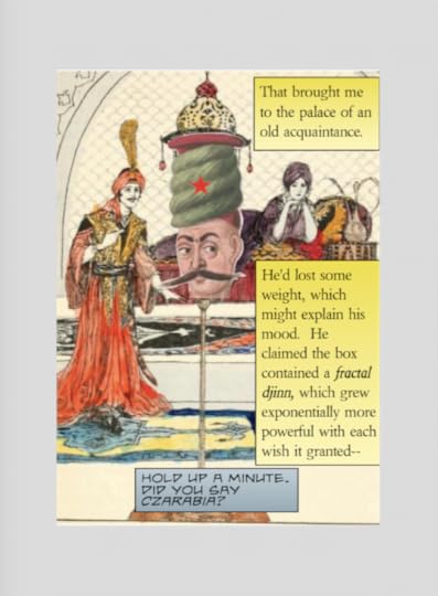 My webcomic is called THE CROSSOVER. It’s set in a multiversal bar where fugitives, mercenaries, smugglers and thieves meet on neutral ground to make deals. My heroine is a version of Alice, one who grew up to become a universe-hopping sorceress who specializes in stealing artificts–items from alternate fictional realities.