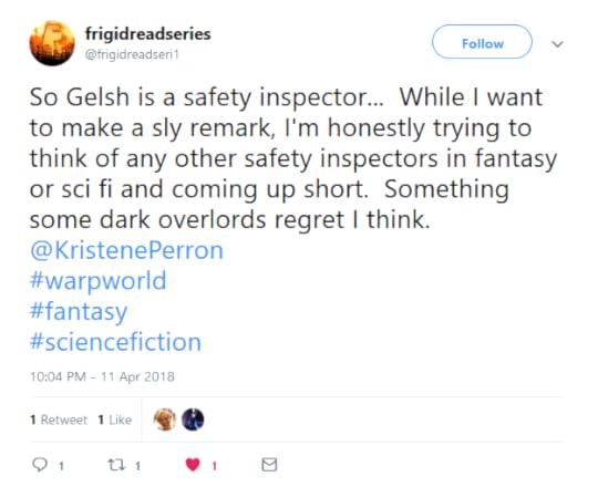 Is Gelsh the first Safety Inspector in SFF?Gelsh is anotherfavorite, though he probably suffered more than anyone from the rewrites. Hisprominent role in the first draft of ForbiddenRevelations got whittled way back and while he still gets to showcase whatI like about him (his loyalty, his morally upright nature, his wit) it doesn’tmatch up so well as what we had in our original version of the fifthmanuscript.