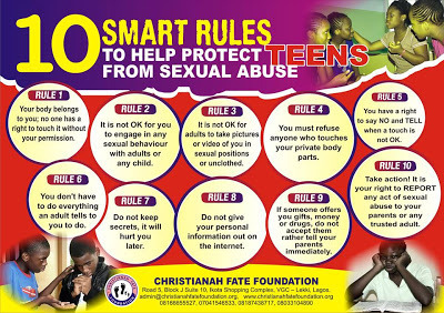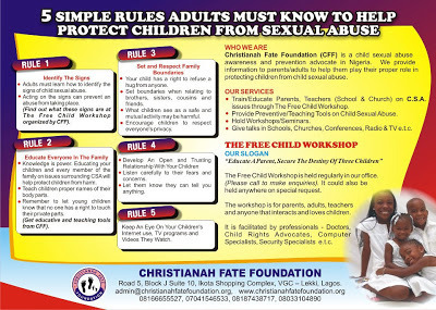 This is the concluding part of the interview on Child Sexual Abuse, with Mrs. Akindolie. Please do not hesitate to reach out to her, if you have any issues along these lines that are giving you grave concern and also get copies of her book for your family library and for friends. Our children deserve to be safe and free enough to live out their childhood in a warm, loving, and nurturing environment. It should not hurt to be a child!!! Let's rally together to
