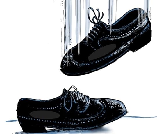 Uneasy yet? You should be. Even this amateurishly scary scene creates suspense–in five different ways.  It also supplies a word picture/graphic of what we’ll be talking about here for the next few weeks, provides the simplest, most basic definition: Foreshadowing is dropping that first shoe so the reader spends the rest of the scene or chapter or book waiting, anticipating, trying to guess when the other shoe will fall.