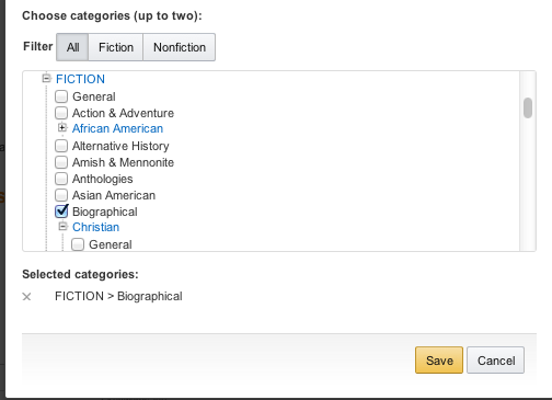 For my purposes, I limited “store” to Amazon, since it is the 100-pound gorilla in the book marketplace. For authors, the single most maddening attribute of our big monkey friend is categories and keywords. One marketing expert wrote that the dashboard categories “are not exactly identical to the customer categories.” You could say that. You could also say that the dashboard categories “only vaguely resemble” the customer categories. On a clear day. In good light. When you’ve just cleaned your cheater reading glasses.