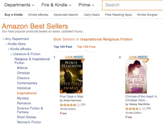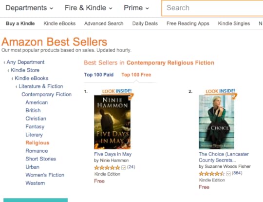 Wait, hold on, there’s more. It was listed #1 in Psychic Suspense, #1 in Inspirational Fiction and #1 in Contemporary Religious Fiction. That’s 3—count them—THREE categories! None of my books has ever been on the Top 100 Amazon Anything List. And Five Days in May just went free yesterday–#1 in only 24 hours! Can you believe it? Just 24 hours!