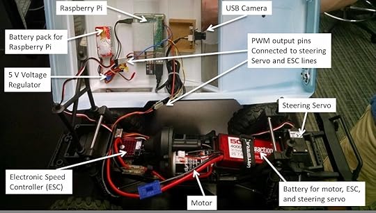 Inside the Bronco. A Raspberry Pi and USB camera constitute the brain/vision system. In this first iteration, the PWM pins on the Raspberry Pi were connected directly to the steering servo and ESC. However, glitches with the PWM output necessitated using a PWM driver board which was added later.