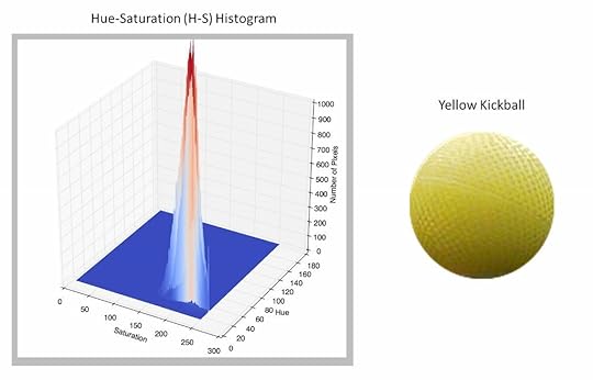 Our first goal was to have the computer detect a yellow kickball. This was done using the back-projected histogram method. First, an image of the ball is used to construct a 2D histogram with binned values of Hue and Saturation for all of the pixels in the ball. For computational efficiency, the “Value” part of HSV was ignored. This Hue-Saturation (H-S) histogram was then used as a kind of filter for detecting the ball in other images.