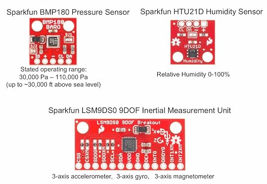 Graham, Max, and I assembled sensor arrays and wrote Python code to collect data from the sensors and store it on the Raspberry Pi’s SD card. The sensor arrays consisted of the BMP 180 Pressure Sensor, the HTU21D Humidity Sensor, and the LSM9DS0 9 degree-of-freedom Inertial Measurement Unit (IMU) from Sparkfun. The three sensors were soldered to a single PCB with their I2C buses connected together in parallel so that the array could be controlled with a single Raspberry Pi.  Two of these sensor arrays were created for redundancy.