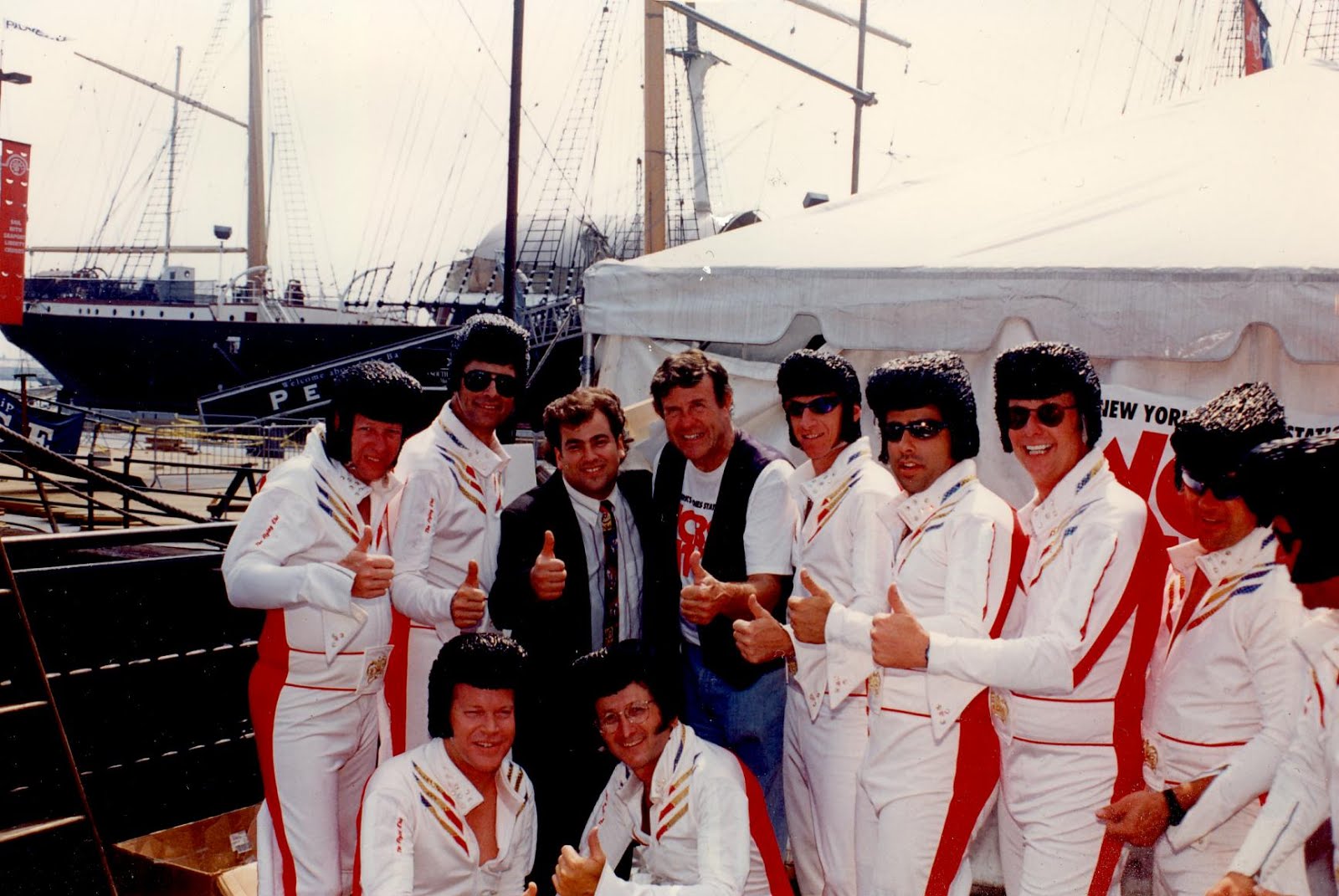 Cousin Brucie and I with The Flying Elvi at Stampfest '96In September of 1996, Bruce served as my on-stage host for StampFest, a postage stamp festival at NY’s South Street Seaport, that drew some 27,000 attendees. Successful as the event was, the ending was shockingly abrupt. Late afternoon hurricane-like conditions suddenly sent the masses scattering… just as the Flying Elvi were skydiving over the East River for our grand finale.I’ll never forget the phone call early the next morning from Cousin Brucie. He roused me from my discouragement and offered to head back down to the Seaport that afternoon to finish up the final performances and ceremony. I raced to get the details organized, then wondered if anyone would bother showing up to witness it.