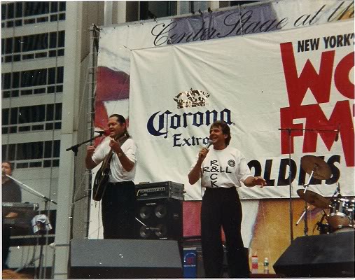 What I best remember about these summer concerts is the incredible backdrop that the towers provided. Each Wednesday, another musical star of the 1960s would play a free mini-concert on a wooden stage, framed by metal stanchion and draped with a huge rectangular banner for WCBS-FM, NY’s Oldies Station. At 12:15, the classic artist and his/her band would be introduced by a CBS-FM on-air personality, like Cousin Brucie or Norm N. Nite. The audio system was powerful enough for passerby’s to hear the music even a couple of blocks away. And the sight of the soaring steel and glass directly above the stage was dramatic, even breathtaking.