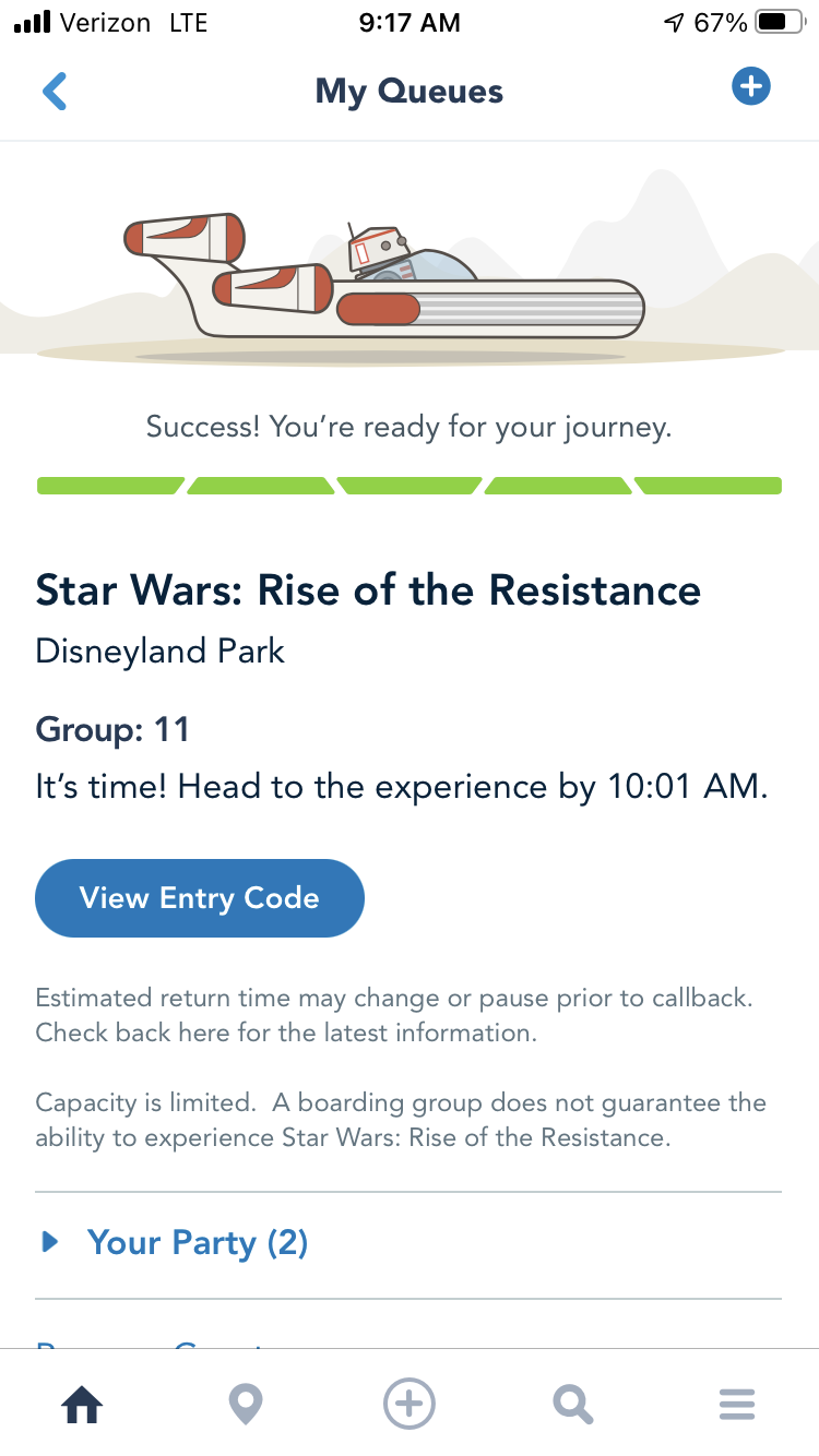 The exception to all this is the newest ride in Disneyland, Star Wars: Rise of the Resistance. Mere willingness to stand in line for extended periods of time is not enough to get onboard this one. Oh, no. If one wishes to partake in the majesty of Rise of the Resistance, one has but two brief windows of opportunity each day. At 7:00 AM and noon, a virtual queue opens for the ride on the Disneyland app, and if one is punctual and fortunate, they can be added to a queuing group for the ride. Basically, it's a lot of refreshing the app and mashing buttons as quickly as possible; anyone familiar with buying limited-edition sneakers and the like online are familiar with the process. Fortunately, we were awake and aware enough at 7:00 to reserve our spot in Group 11. God only knows how swift of finger and blessed of wi-fi you'd need to be to get into Group 1.