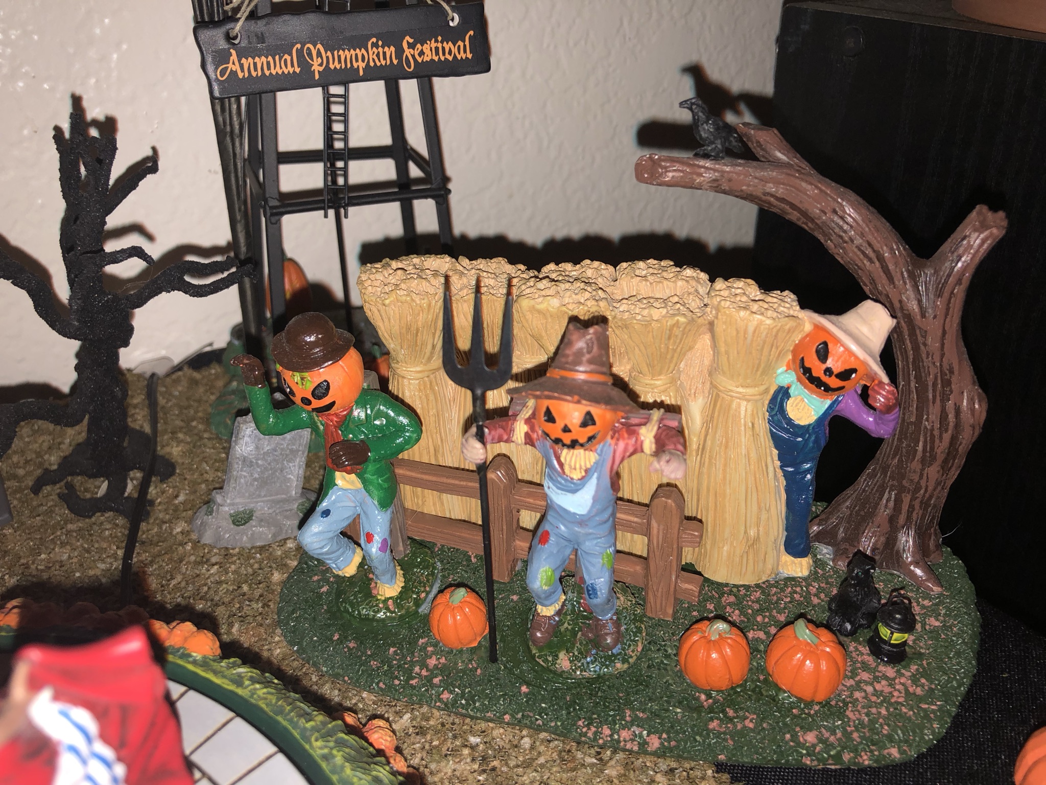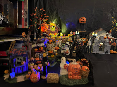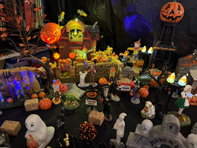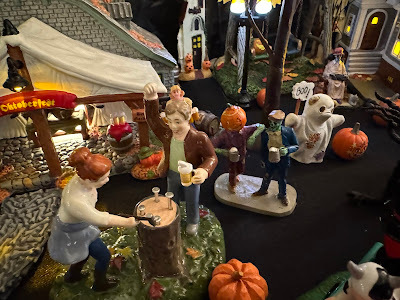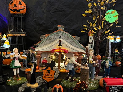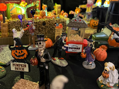 Lemax and Dept. 56, for those not as deeply ensconced in the holiday village display lifestyle, are the two major companies that produce such decorations. Ever year, they hit us with a fresh wave of autumnal delights, from the cute and wholesome to the gruesome, macabre...and still somehow wholesome. I think the wholesomeness is sort of baked into these types of hobbies. And because those of us who pursue this very niche passion need time to plot these things out, the new figurines, houses, etc. are released many months ahead of time.