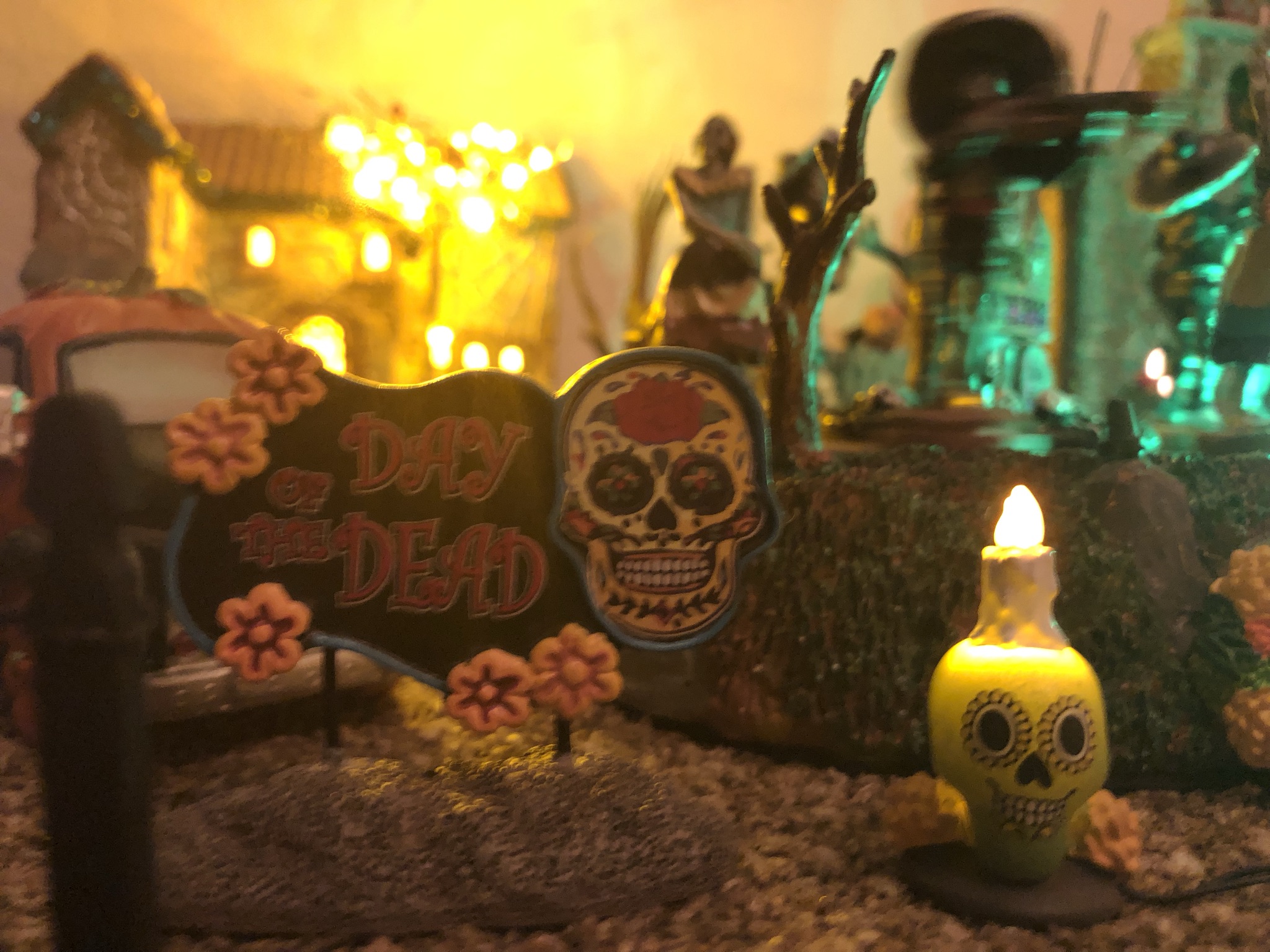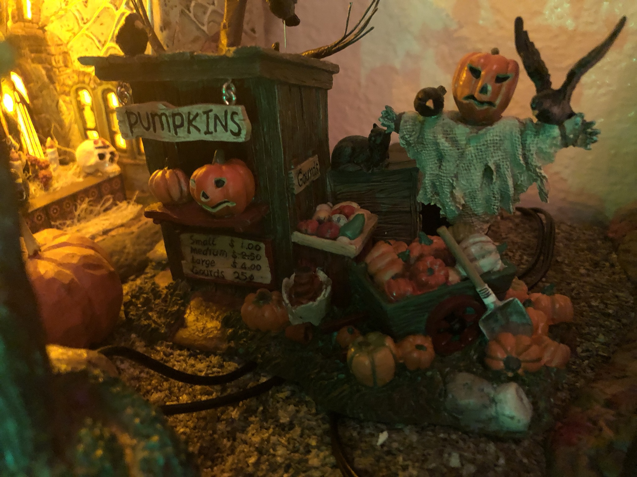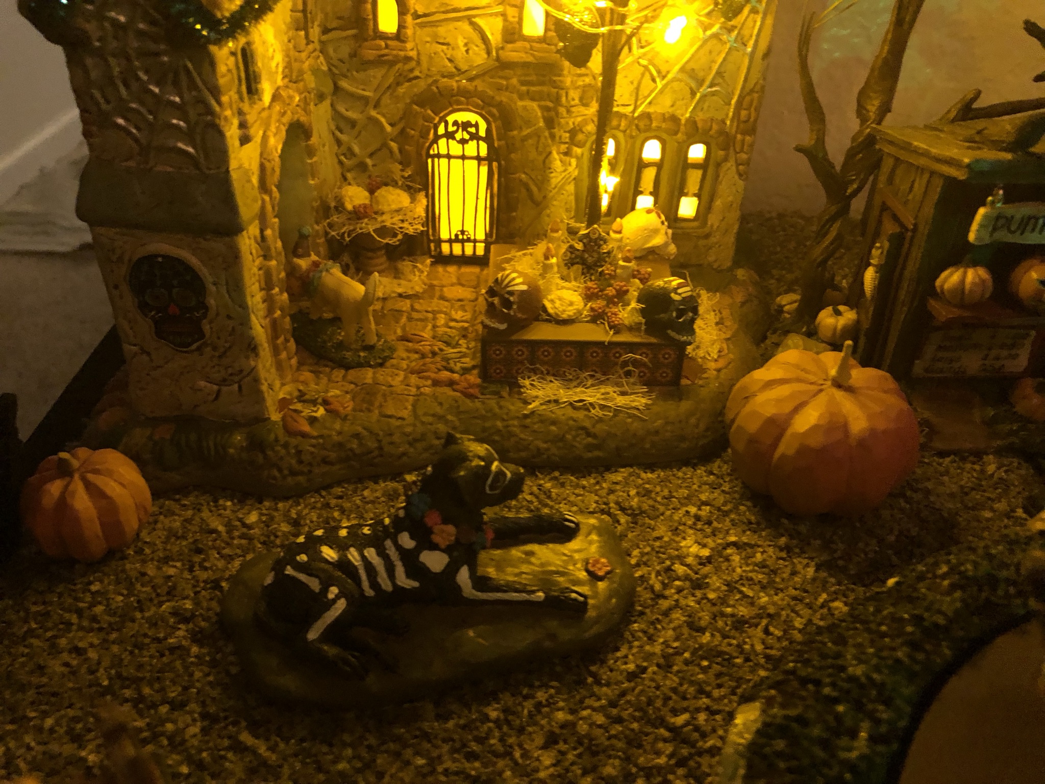 There are pets in the pumpkin patch nonetheless, so there One thing I quickly realized is that I would need to buy some new items to serve as light sources, because the Dia de los Muertos stuff exudes an abundance of glow, and in its absence I would need a helping hand in terms of ambient lighting. No sugar skull streetlamps this year, buddy! But again, this change presented opportunity, as it motivated me to peruse Lemax's offerings more thoroughly in search of options.