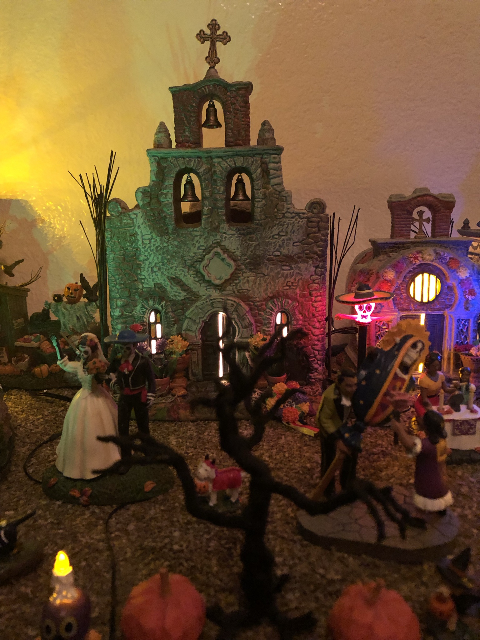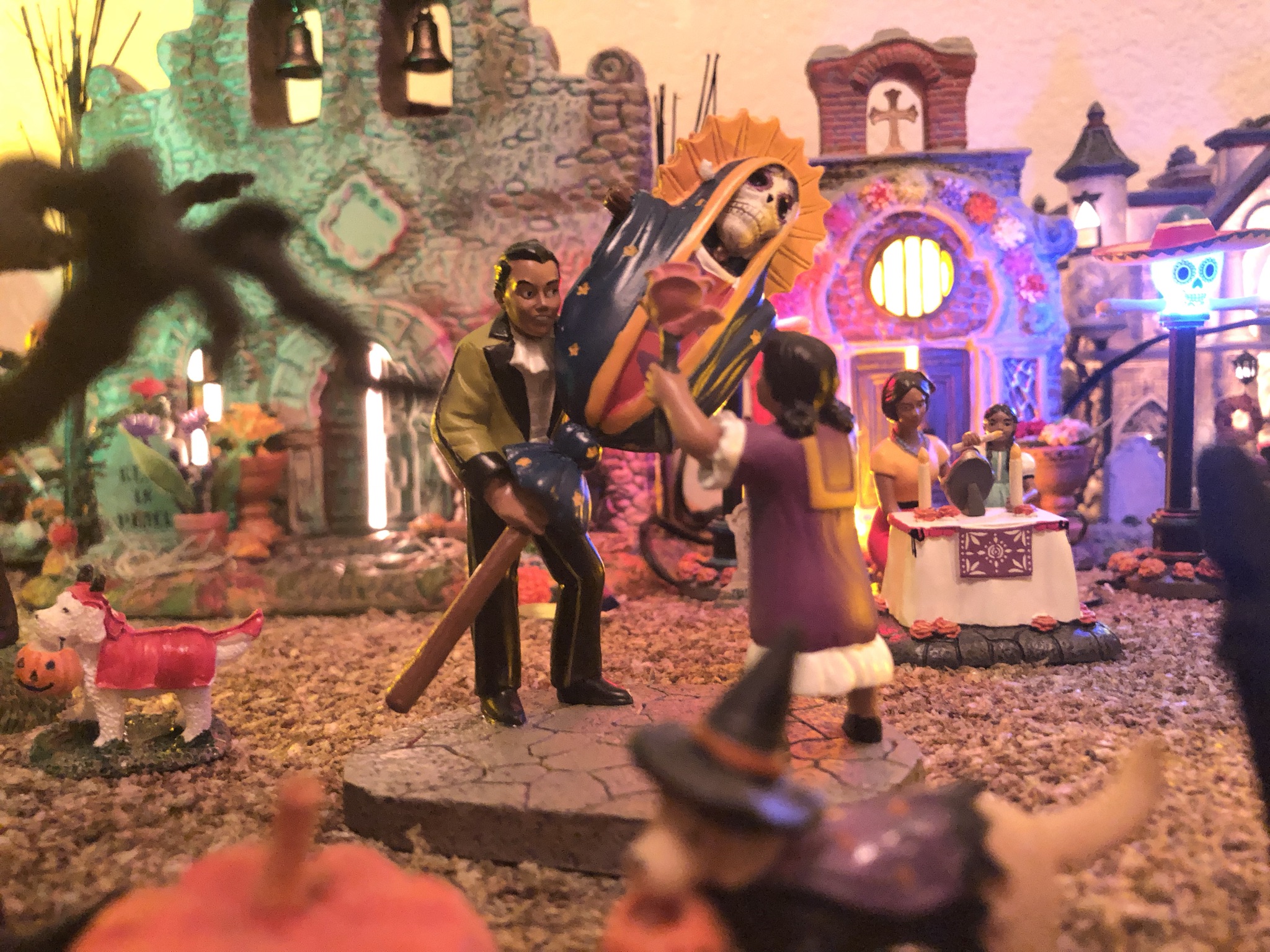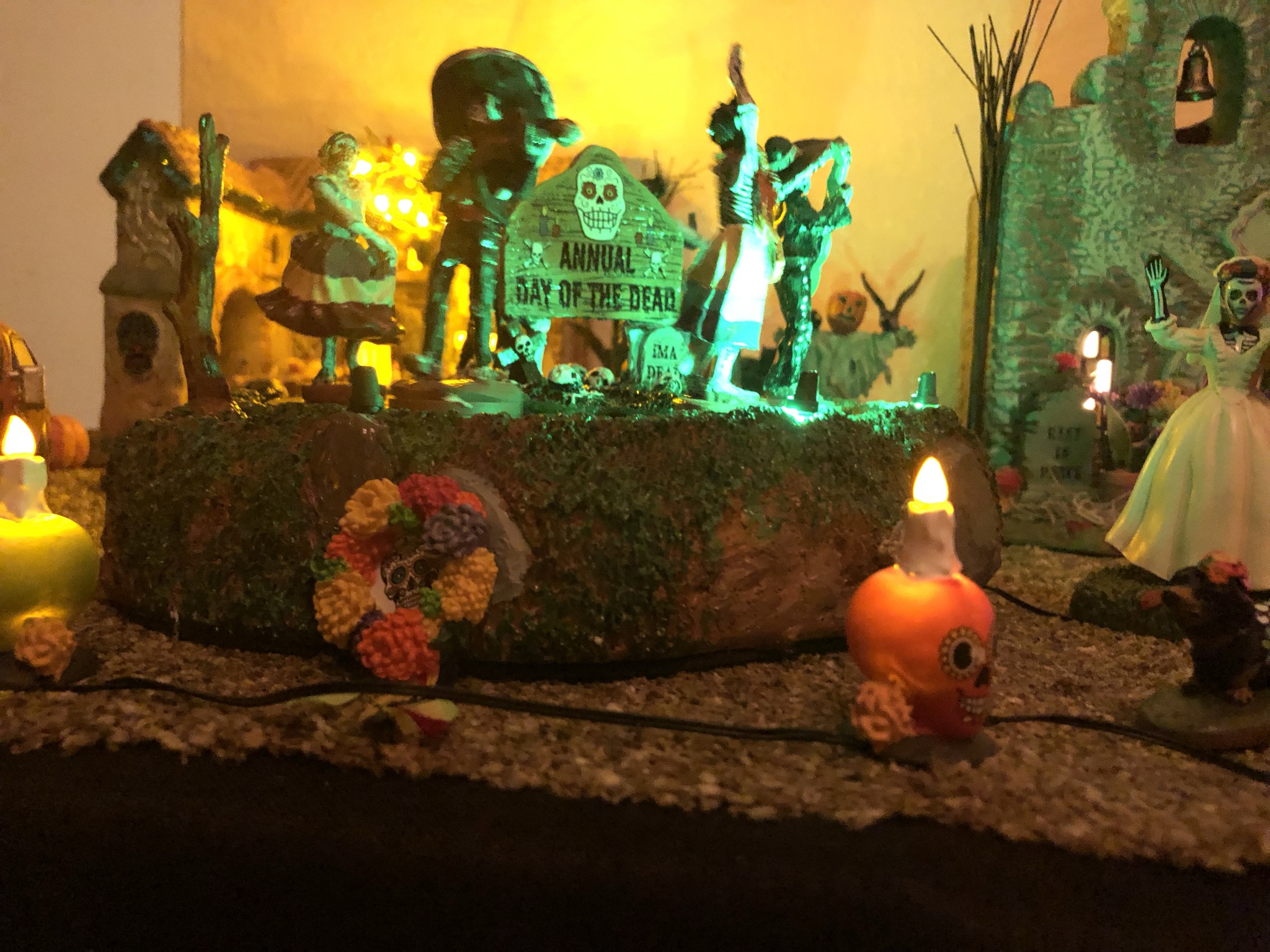 There are pets in the pumpkin patch nonetheless, so there One thing I quickly realized is that I would need to buy some new items to serve as light sources, because the Dia de los Muertos stuff exudes an abundance of glow, and in its absence I would need a helping hand in terms of ambient lighting. No sugar skull streetlamps this year, buddy! But again, this change presented opportunity, as it motivated me to peruse Lemax's offerings more thoroughly in search of options.
