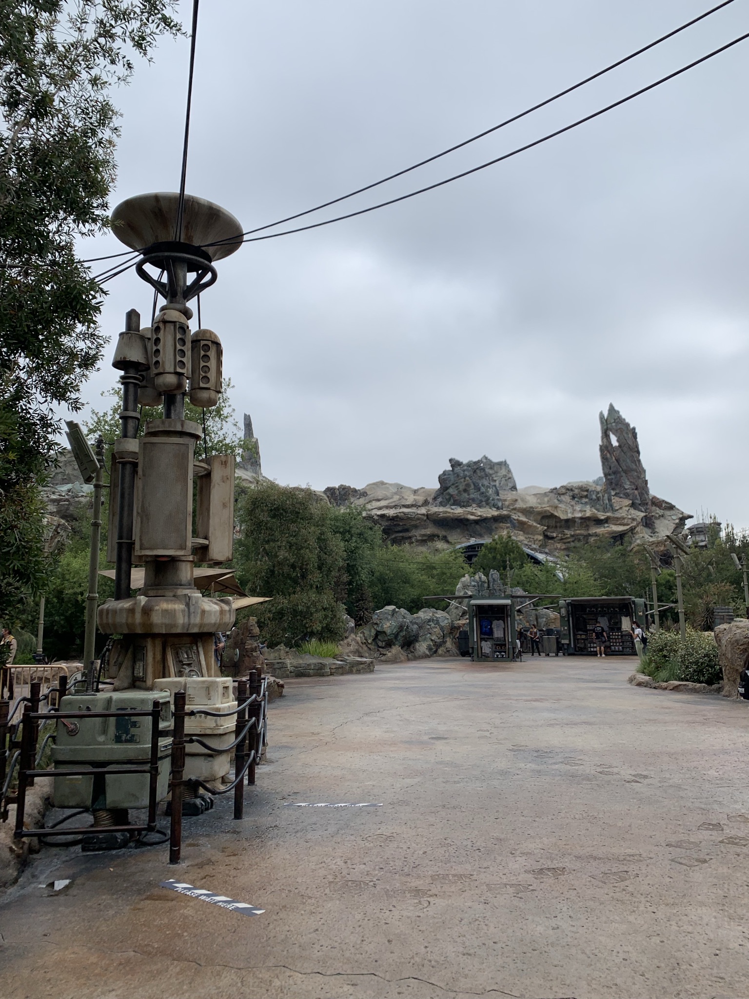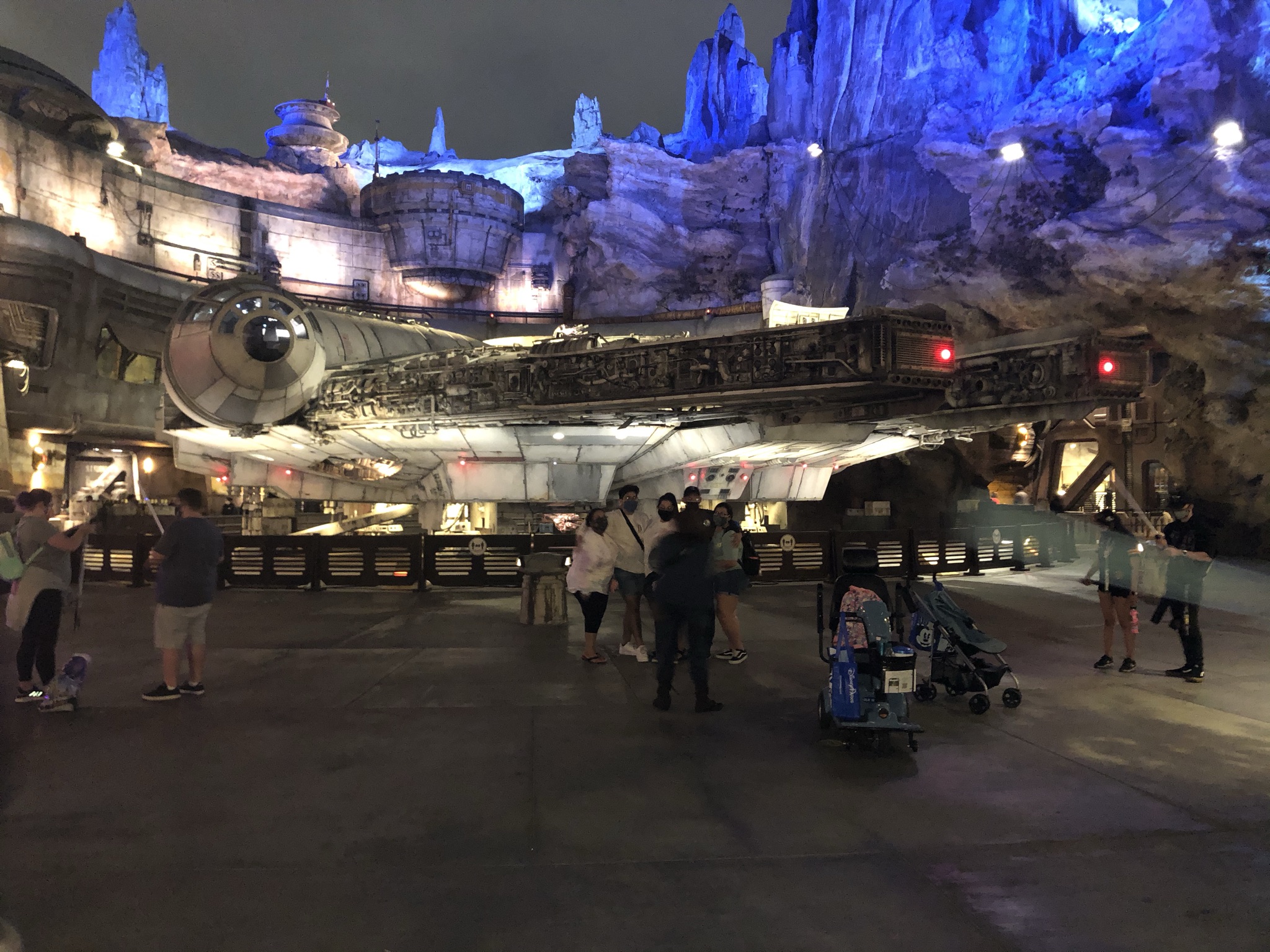 Armed with a group number, we started off the day by heading to Star Wars: Galaxy's Edge, the newest land at Disneyland and one which, pre-pandemic, I thought I might have to wait years to see, given its popularity and the corresponding overwhelming crowds. However, at the beginning of the day (it was about 8:45 AM...the park wasn't supposed to open until 9:00, as I mentioned, but we entered shortly after 8:30 and people were already free to disperse as they please throughout), Galaxy's Edge was empty, an eerie alien ghost town of abandoned starfighter ships dotted with the tracks of unseen otherworldly beasts. It was, frankly, amazing, its aesthetic a new benchmark for the always lush and detailed Disney park design. Between its looks, emptiness and nestled isolation from the rest of the park, it truly felt like we had been transported to, well, a galaxy far, far away.