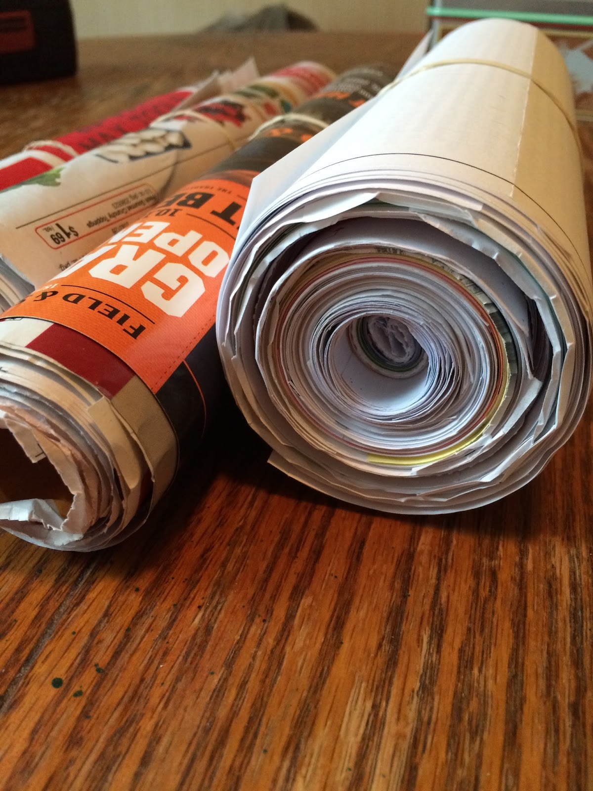 Step Four: Roll them. Wrap the roll with a rubber band while you set up more papers to continue rolling.
