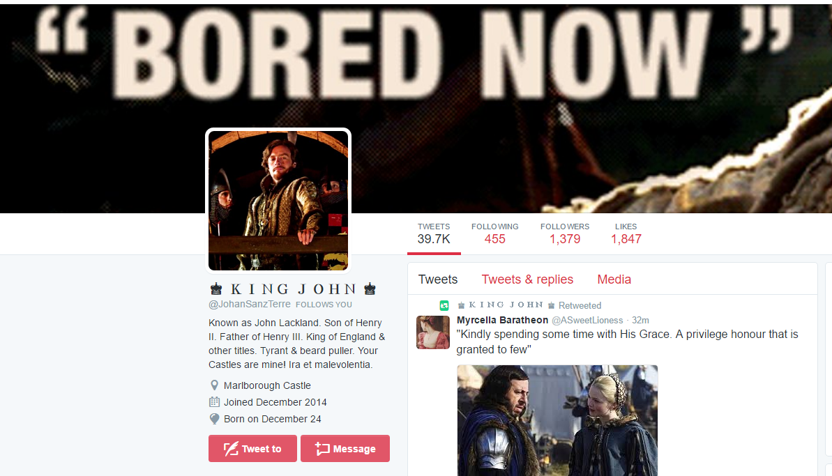 Yes- it's King John on Twitter. #unexpectedBoth Erica and I are followers of (and are followed by) the man himself @JohanSanzTerre. John aside, Erica and I developed a mutually supportive relationship on Twitter. As with many online relationships, they remain just that. But at the Historical Novel Society's Oxford conference in September, fate intervened. The main dinner on the Saturday evening saw rain that was bouncing off the pavement and a mad scramble for seats and dryness. It may also have been the sniff of drink: historical novelists tend to drop all decorum when that's mentioned. In the random assembling, a woman dropped into the seat next to mine. Of course we introduced ourselves: historical novelists like to find out just who we're fighting for that bottle. And of course it was Erica. And of course we tweeted King John.