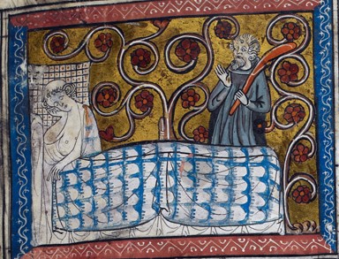 From: The Roman de la RoseThe Lover (L'Amans) in bed with a man (Dangier, or Danger) holding a club.