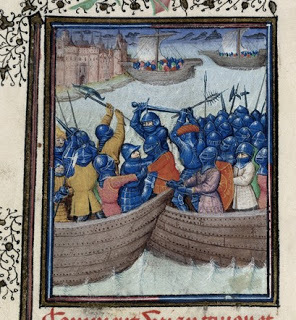 Battle scene at sea from Roman de M��lusine by Jean d'Arras c. 1450Public Domain via British LibraryHer father was Ademar, Count of Angouleme, and a Taillefer. His ancestors had been put into Angouleme in the mid-9th century by Charles the Fat, a great grandson of Charlemagne, to repulse the Vikings as they raided all the rivers of France. They came up the Charente to Angoul��me three times and three times were driven back. What was once a wooden fort on a rocky promontory became a stone castle with commanding views.