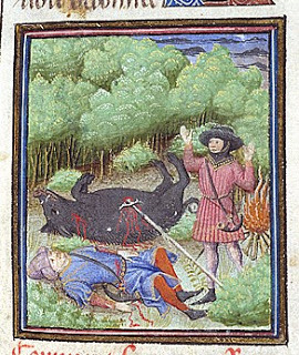 Detail of miniature from Roman de M��lusine depicting Raymond accidentally killing his uncle while hunting in the forest.
