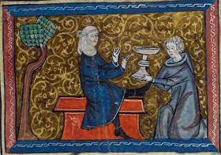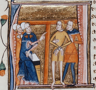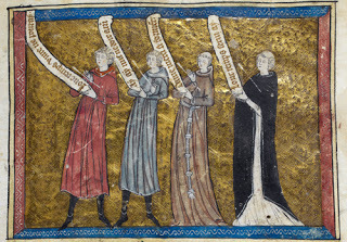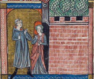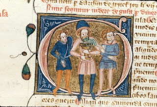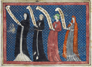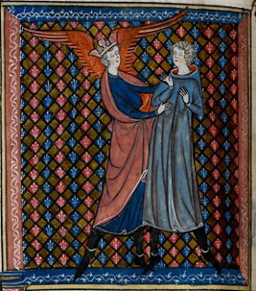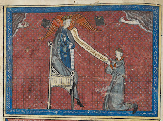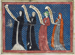 I have chosen the images from a manuscript from c1320-1340 for this post. Interestingly, it is a non-religious work, so no saints (of which more later). The fourteenth century also saw the introduction of a custom for lovers within court circles that is still with us: Valentine's Day. February 14th is the day that the medievals reckoned birds began mating. So why not have a day when refined men and women could do the same in elaborate rituals and games?