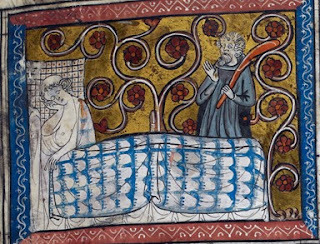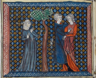 Envie (Envy) looking at a pair of lovers.What's even more interesting is that Margery's mother Elizabeth also writes to John to ask that the marriage takes place on 'Sent Volentynes Day'... [when] every brydde chesyth hym a make.' Yes, we have mention of the bird choosing a mate again. But we also have reference to Saint Valentine. It is likely that clerics began making the connection between a saint and the secular customs around finding a partner. Two third century saints were named Valentine: Valentine of Rome and Valentine of Interamna (modern Terni in Italy). We know little about them other than they were martyred and that is commemorated on February 14. They had never been associated with lovers up the middle ages.