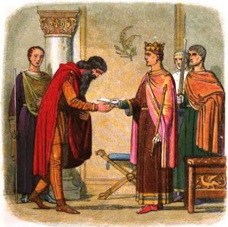Henry II grants Dermot MacMurrough permission to raise forces to take back the kingdom of Leinster.As depicted by James William Edmund Doyle, 1822- 1892 (Public Domain)