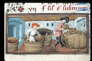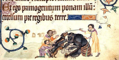 Bearbaiting, mid 14th century England British LibraryWhat was important in terms of timing for my novel was that bear baiting was a major spectator sport and took place on feast days. Feast days were literally red-letter days on the medieval calendar, of which more later. They consisted of Easter, Pentecost, Christmas, and Epiphany, along with an elaborate calendar of commemorations and feasts of saints. They were similar to our holidays, in that people were excused from work and ate and drank as richly as they were able and took part in leisure activities. January 1st was celebrated as a feast day. January 1st—New Year’s Day, right? Wrong.