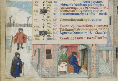 Calendar page January c1497 British LibraryIn the liturgical calendar, Christmas is a twelve-day feast. In case you’re thinking the medievals had it easy, think again: the entire season of Advent, in which people prepared for Christmas, was one of fasting. January 1st, the eighth day, was celebrated as the Octave of Christmas, so that worked. My bear baiting was taking place when it should have. When I figured out times for the news of the murder to reach London, it worked out perfectly that Brother Cuthbert had been murdered on Christmas Eve.