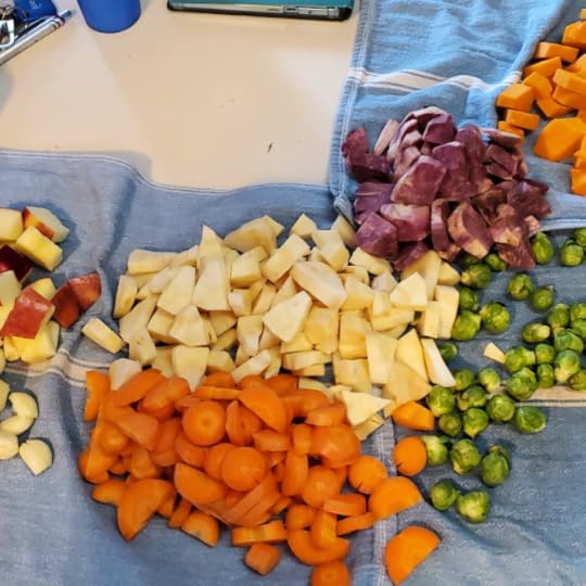 The veg that we roasted for the feast:  apples, garlic, parsnips, butternut squash, carrots, leeks, sweet potatoes (purple and orange) and a few baby brussels sprouts.