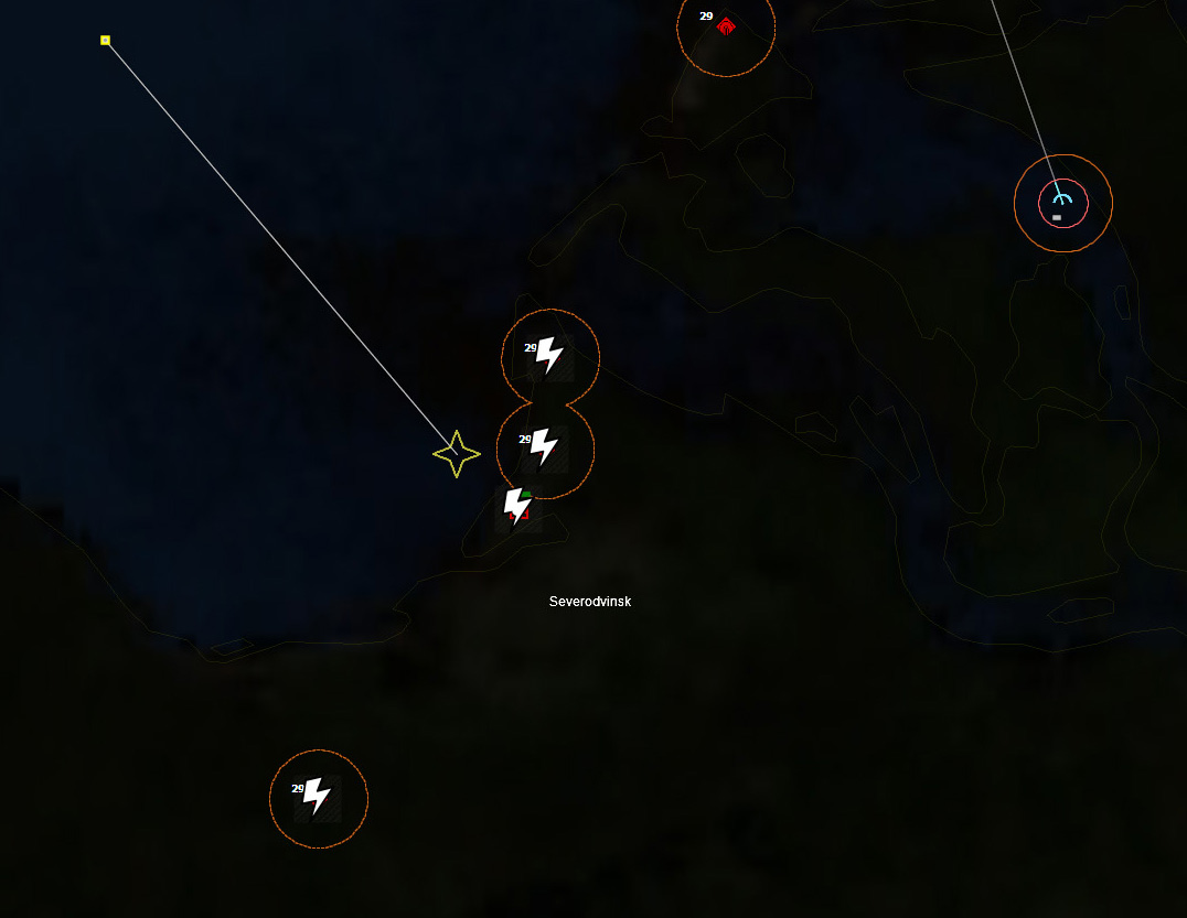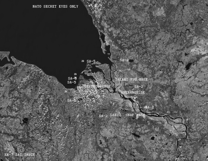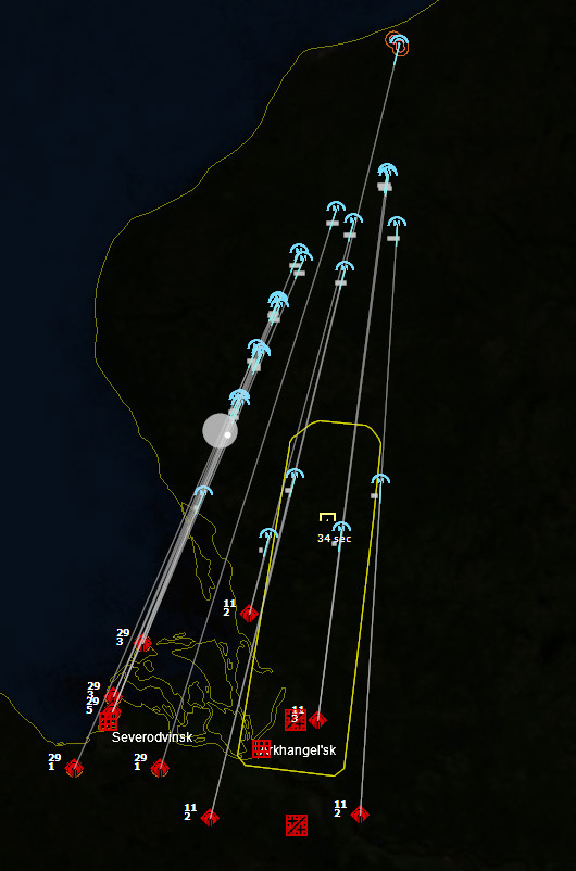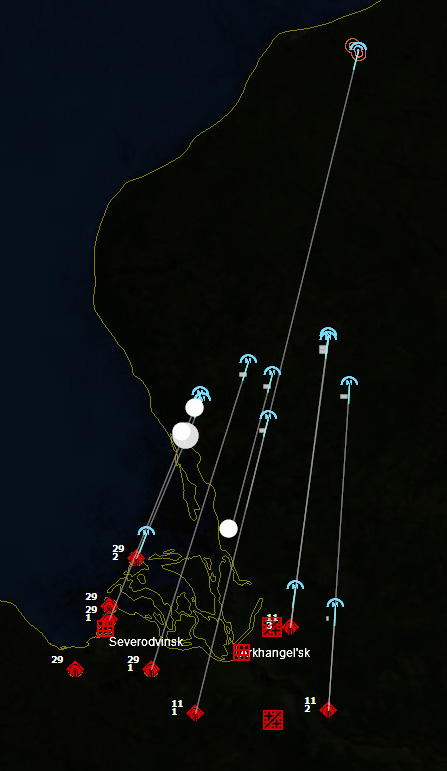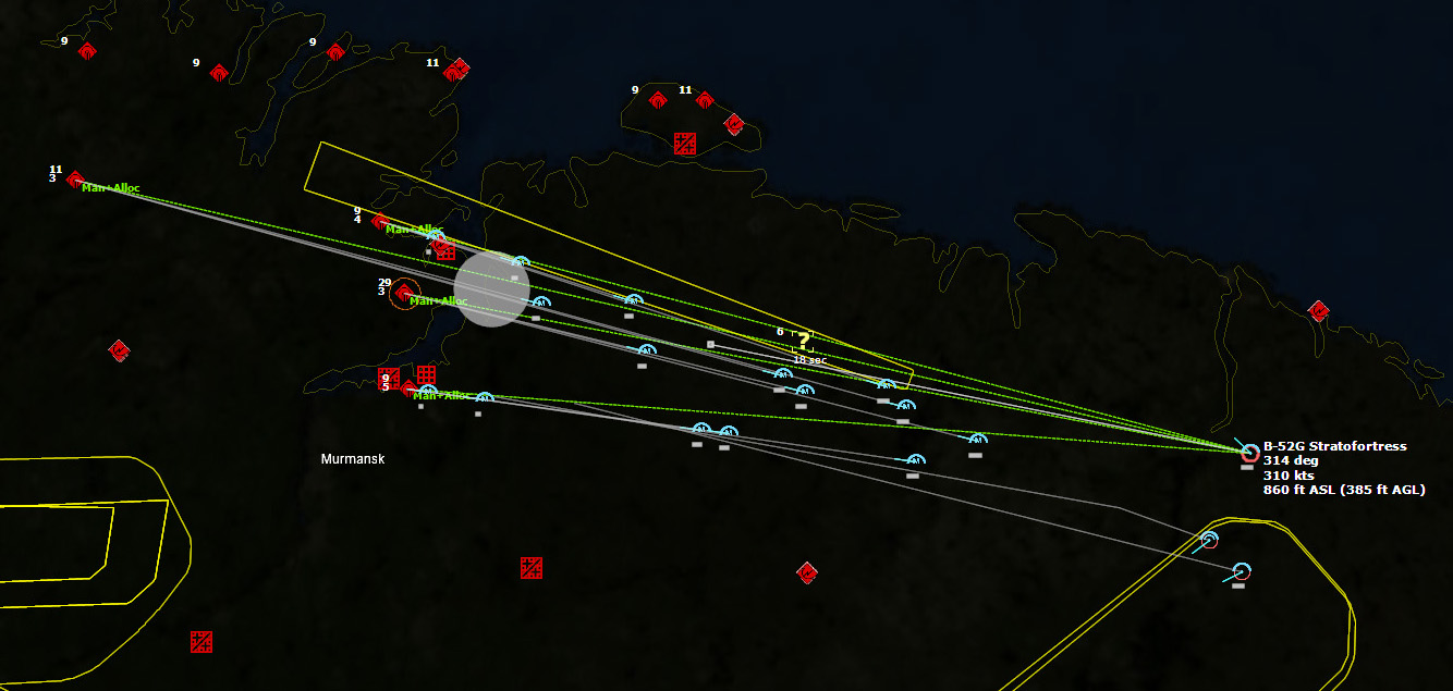 Nuclear explosions fill the dawn sky north of Arkhangelsk.The SA-2f Guideline site next to Talagi is hit.When it's all over, two SA-2f sites are taken out, and one SA-5b site. Arkhangelsk still has plenty of defenses left. Caveman 4 splits into three individual aircraft, two headed for the primary target Severodvinsk, and one for the secondary target Arkhangelsk.