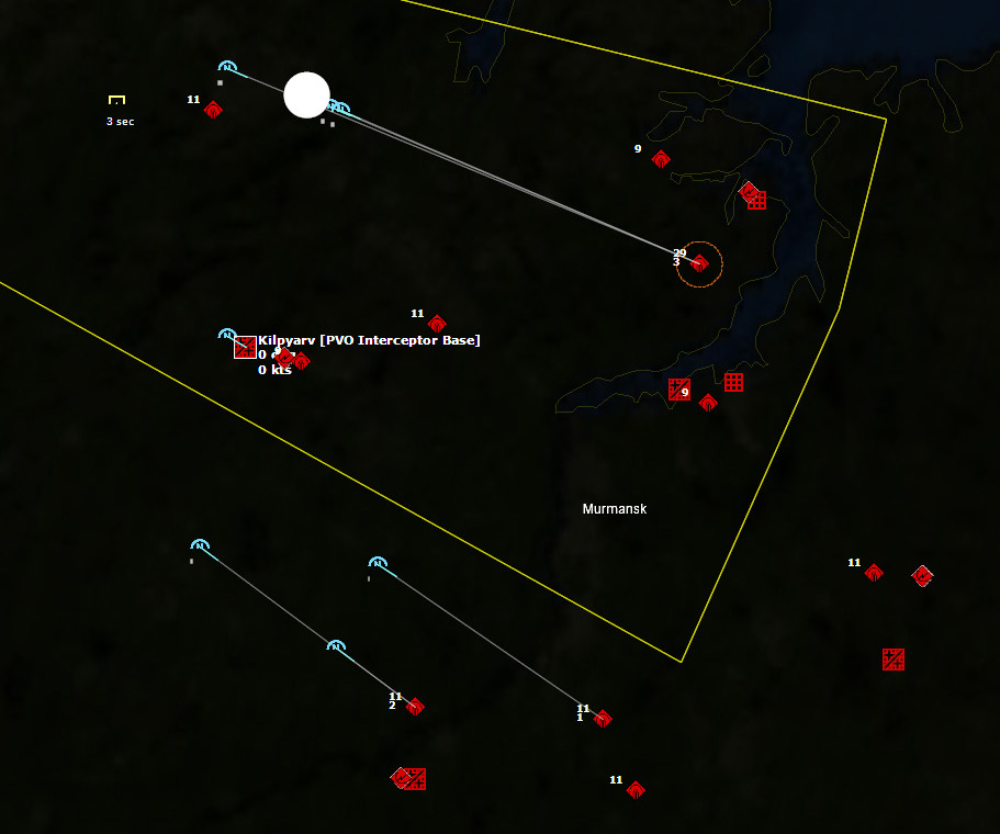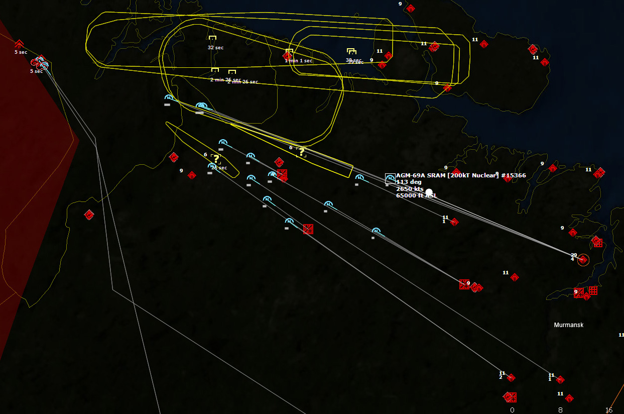 Kola Nuclear Power Station is destroyed.Caveman 1 and Caveman 3 both turn for home.Caveman 4, meanwhile, has the most difficult mission of all, taking out Severodvinsk and Arkangelsk. They are protected by no less than 15 SA-5b Gammon battalions, each with 12 25kT nuclear SAMs, for a total of 180 nuclear SAMs. In addition to that are four SA-2f Guideline battalions, totaling 24 more SAMs. As such, Caveman 4 launches all of its 24 SRAMs at the SAM batteries in an attempt to punch through. Climbing to launch altitude is risky, but it has to be done.