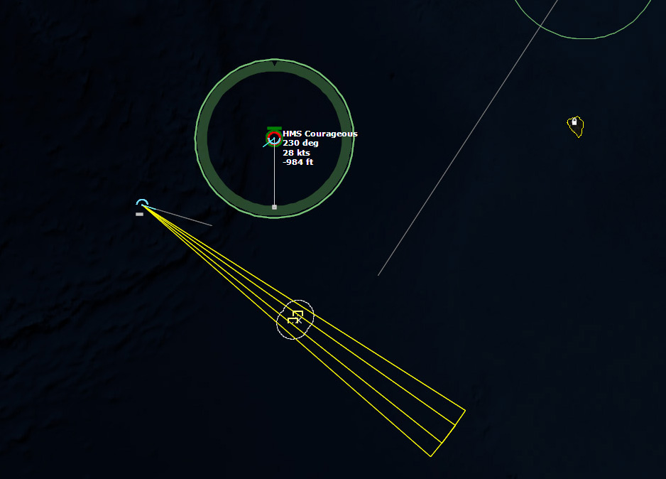 HMS CourageousI search for hours, and every so often I lure Yaks to take off and go after my Rivet Joints, which then evade, but it gives me updates on the position of the Kiev. Finally, it appears that the Kiev is so far ahead, I am forced to send the Courageous deep and to flank speed (thankfully deep enough so it doesn't cavitate) in an attempt to catch up. Tinosa is caught in shallower water so I can't risk it going fast, and thus lags far behind.031941Z Courageous must be getting close...and it could be the end. It detects a high frequency sonar. I immediately slow down and change course, hoping to lose the contact. I suspect, however, that since I have been detected, Courageous is probably doomed.
