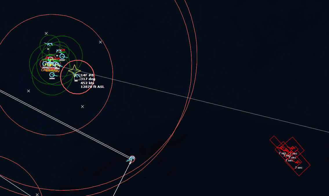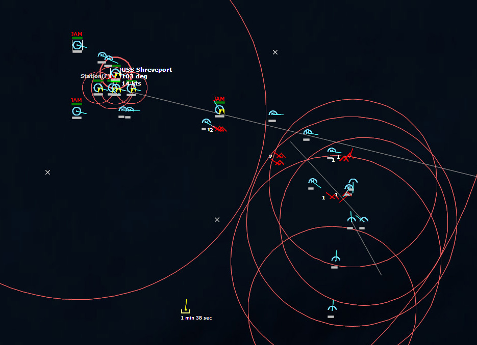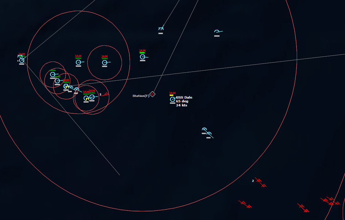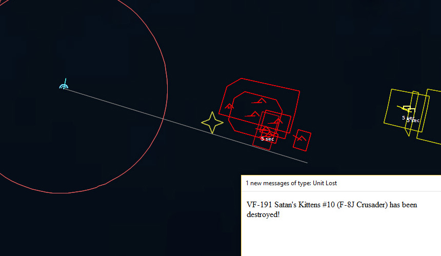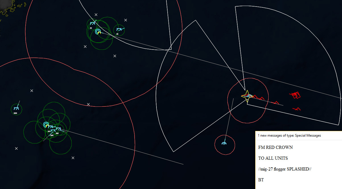 Splash OneIn rapid succession the Crusaders gut the strike package, shooting down ten more MiG-27s. That leaves one single Flogger left for the pair of French Crusaders that arrive on the scene. The French Crusaders have difficulty locating the Flogger with their inferior radar, which closes uncomfortably close to the Iowa group. The Iowa group lights off its radar. USS Harry E. Yarnell fires a RIM-67A at the Flogger, bringing it down. However, lighting off the group's radars might have had an unintended consequence, as multiple vampires are detected. Possibly from a submarine that has been lying in wait, and the radar emissions from the surface group tipped it off.