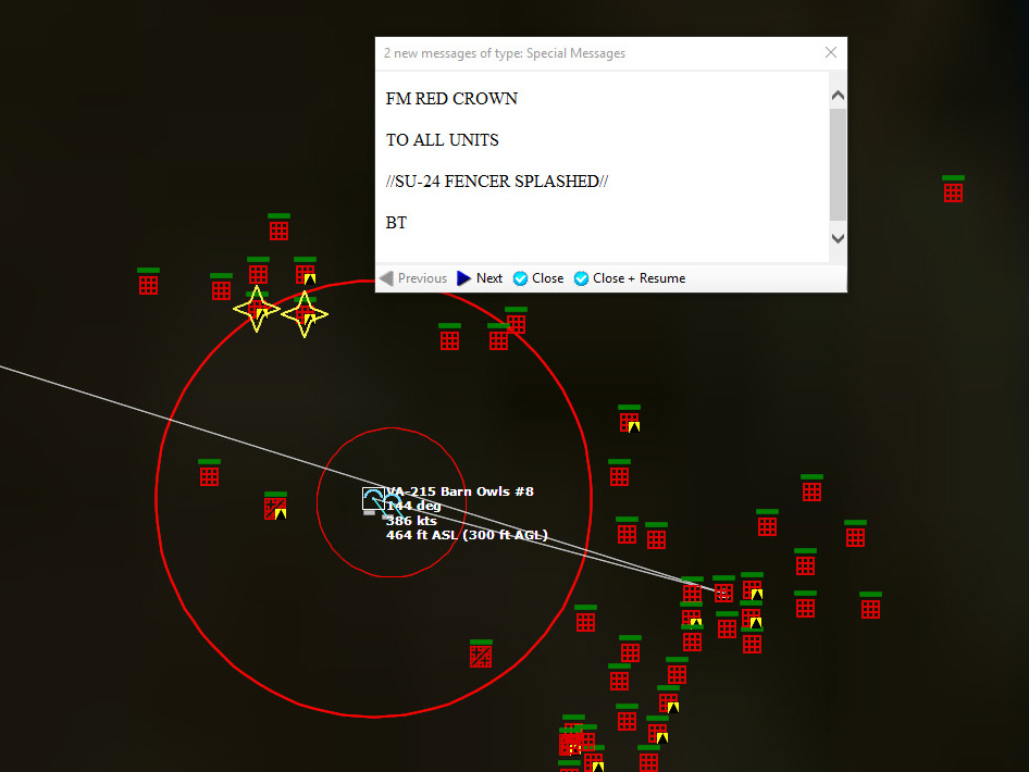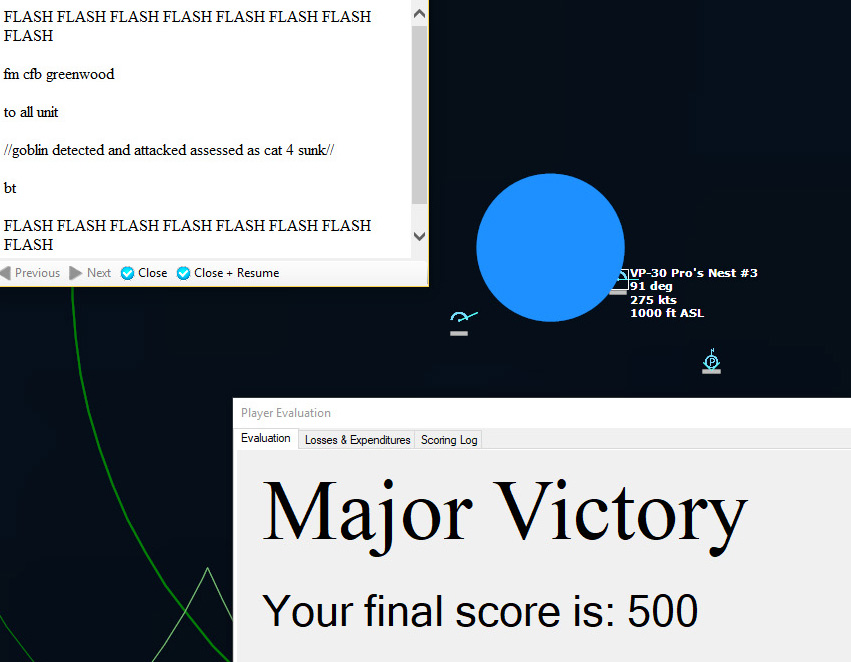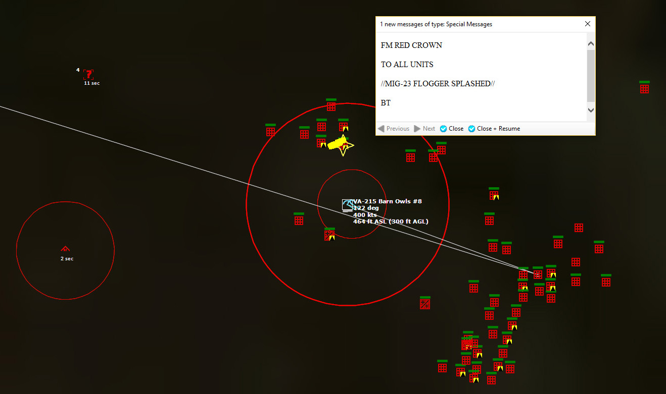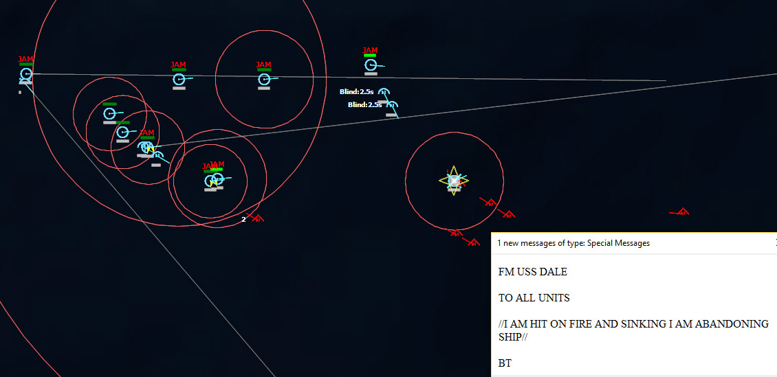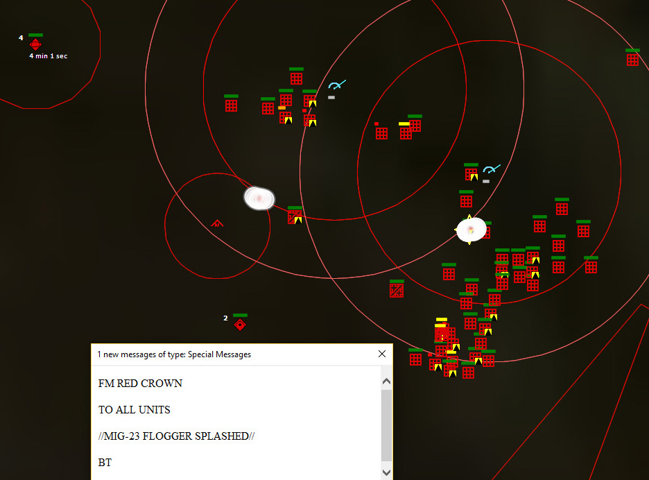 Splash OneIn rapid succession the Crusaders gut the strike package, shooting down ten more MiG-27s. That leaves one single Flogger left for the pair of French Crusaders that arrive on the scene. The French Crusaders have difficulty locating the Flogger with their inferior radar, which closes uncomfortably close to the Iowa group. The Iowa group lights off its radar. USS Harry E. Yarnell fires a RIM-67A at the Flogger, bringing it down. However, lighting off the group's radars might have had an unintended consequence, as multiple vampires are detected. Possibly from a submarine that has been lying in wait, and the radar emissions from the surface group tipped it off.