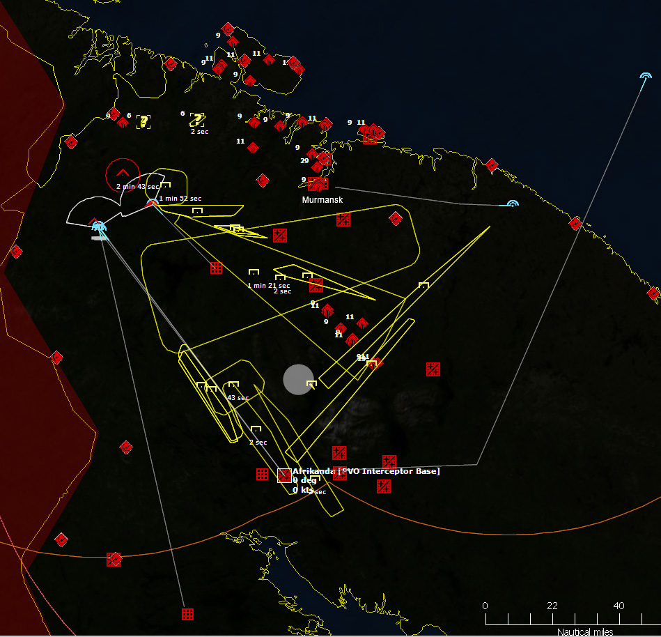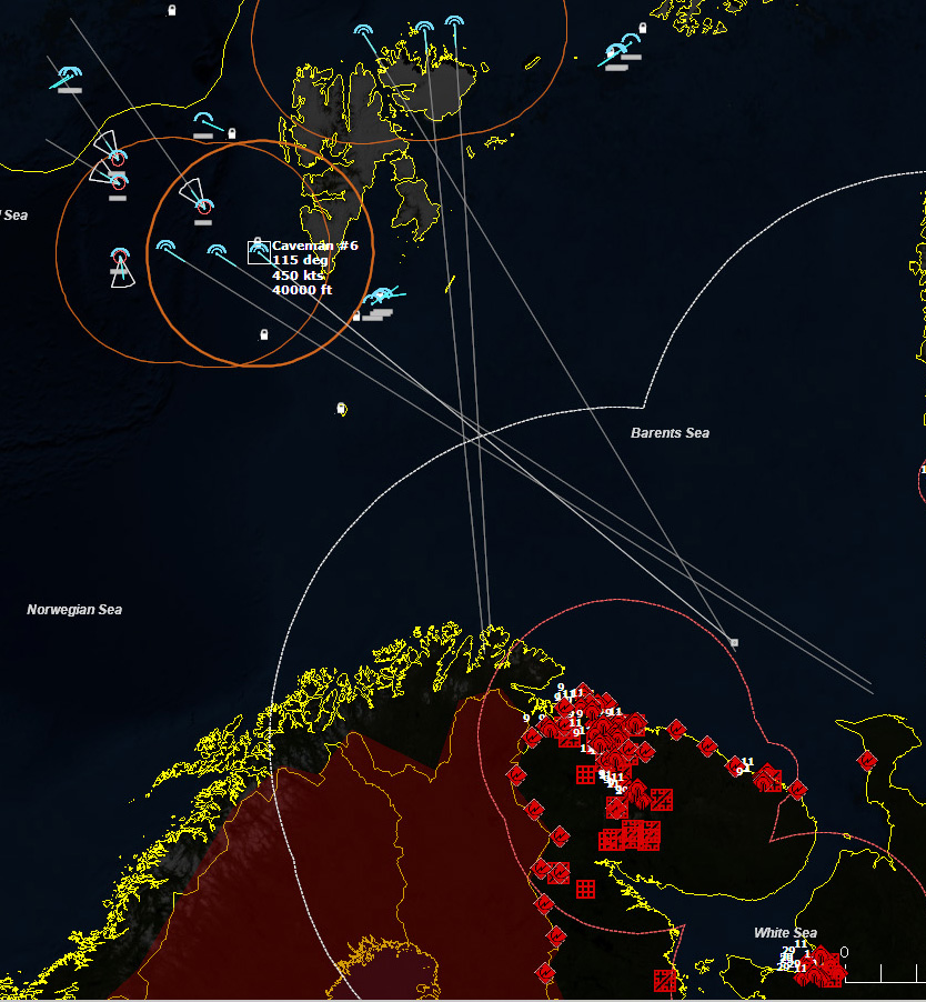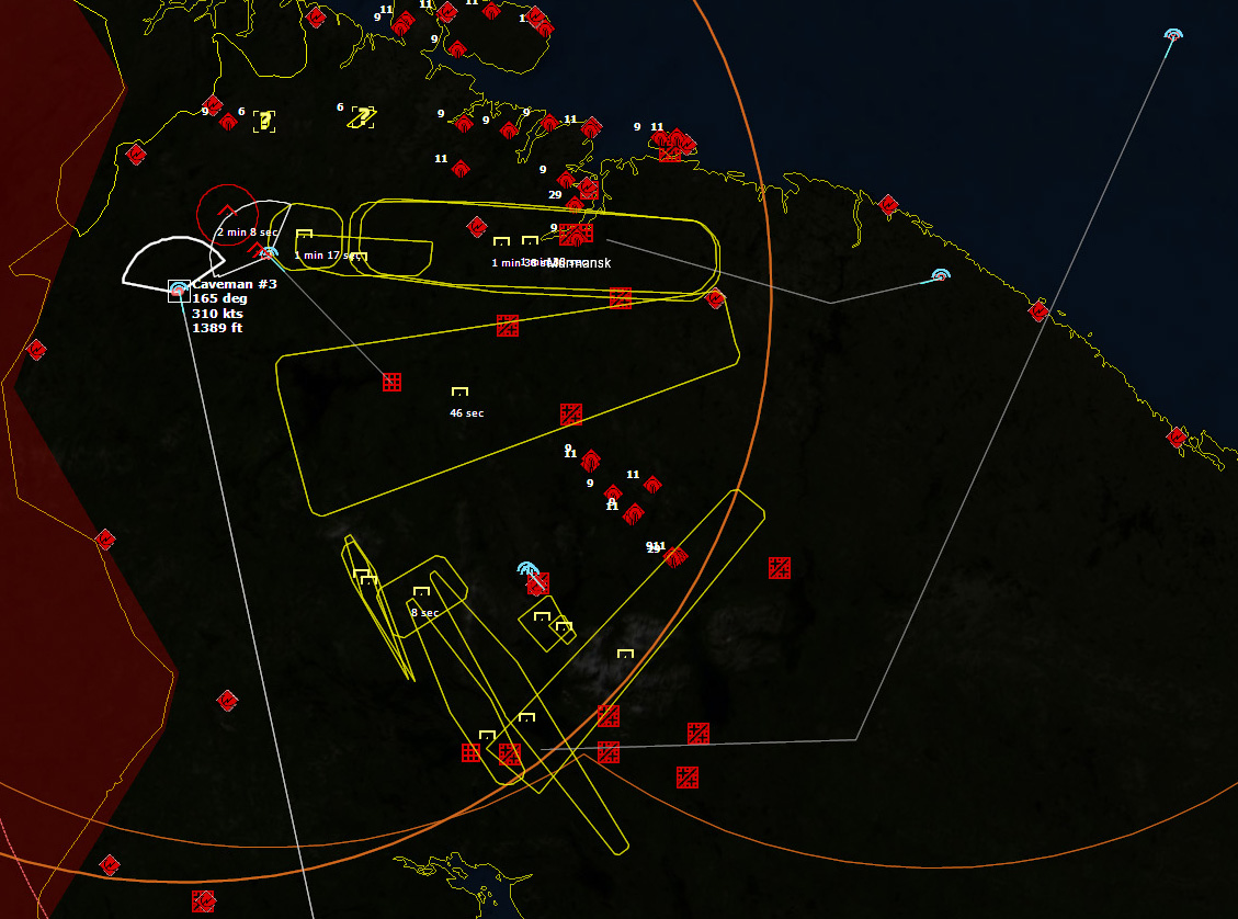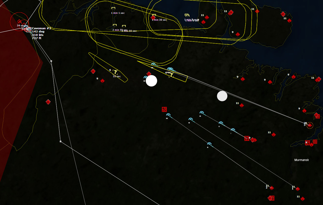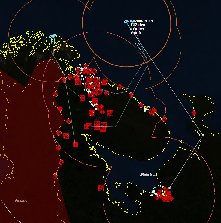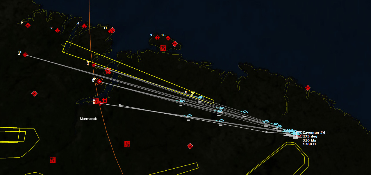 Another B-52 is lost.040928Z Poduzheme is hit and destroyed.041501Z Caveman 1 is within 20nm of its target, Kola Nuclear Power Station, but it is being pursued by two Tu-128 Fiddler As. It is possible that by the time they gets into range of its bombs, they might get shot down. However, Caveman 3 is returning from its own target, and is some 26nm from Kola Nuclear Power Station. If Caveman 1 fails, Caveman 3 will pick up the slack.